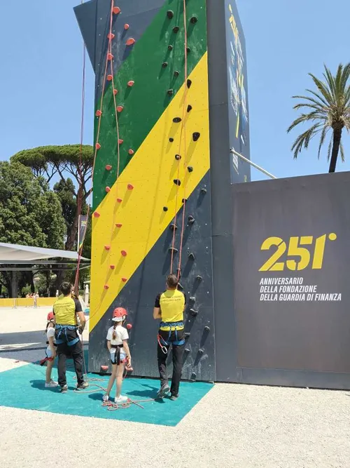 Questa volta l’evento della GdF si è svolto all’insegna dello sport per coinvolgere anche lo/la studente/ssa più svogliato/a, attraverso situazioni accattivanti e “avventurose” come la parete di arrampicata che troneggiava su tutto lo spazio dall’alto dei suoi 15 metri di altezza. Nella famosa terrazza di Villa Borghese, affacciata su piazza del Popolo, con la basilica di S.Pietro all’orizzonte è stata allestita una sorta di Villaggio dello Sport dove, soprattutto i/le bambini/e e i/le ragazzi/e, sono stati/e invitati/e a provare uno dei tanti sport attivati presso i centri sportivi della GdF, le ben note Fiamme Gialle, che insieme ad Esercito, Carabinieri e Polizia monopolizzano la pratica sportiva nei livelli agonistici: «Non proponiamo diverse discipline sportive solo a quei pochi che entreranno nelle squadre agonistiche» – ha tentato di controbattere un ufficiale, sollecitato dalla nostra domanda sul perché avessero deciso di presentare un corpo militare attraverso una sua sezione organizzativa tutto sommato più che marginale. «I nostri impianti, infatti – prosegue nel suo tentativo il finanziere – sono aperti a tutta la cittadinanza ma soprattutto ai ragazzi». Nella realtà ciò è vero solo in parte. Molti club, associazioni, squadre, infatti, semplicemente si “appoggiano” agli impianti sportivi un po’ come le scuole fanno con le loro palestre nei periodi estivi aprendosi alle associazioni sportive nel perio di fermo delle lezioni.