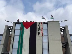 Dopo circa un’ora durante la quale il corteo ha fatto il giro dei vari stabilimenti della fabbrica, issando bandiere palestinesi sugli aerei militari e scandendo cori contro il riarmo, é stato srotolato dal tetto di uno di essi un enorme bandierone palestinese e uno striscione con scritto STOP RIARMO, la digos è arrivata per identificare i presenti.