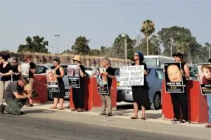 Nel clima di tensione bellica, però, la cautela è d’obbligo. Per questo, la mobilitazione è preceduta da un briefing in cui si ripassano le regole di “ingaggio”: stare uniti, non cedere a eventuali provocazioni, non ribattere, prepararsi a “scenari sfavorevoli” ovvero l’arresto o un pestaggio da parte di qualche fanatico. Stavolta si incontrano in un luogo neutro della Road 40: l’incrocio tra Bilu e Gedera, nel tardo pomeriggio. Da là guidano in corteo, per una decina di minuti, fino a Tel Nof. Per molti militari, quell’orario coincide con la fine del turno. Le loro auto rallentano mentre costeggiano la sequenza di foto rette raccolte pazientemente, a partire dal 7 ottobre, insieme ai nomi e a frammenti di storie, dall’artista e attivista Adi Argovi con il progetto “Forcibly involved”, “coinvolti per forza”.
