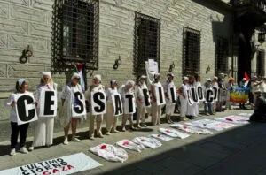 Pertanto continuiamo a manifestare con la responsabilità dei nostri corpi, simbolo della ferma difesa della pace contro ogni guerra, invitando tutte e tutti a incalzare coloro che possono favorire o promuovere passi verso una pace giusta di cui il primo ma non unico passo è la fine dei massacri disumani.