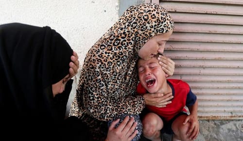 Una donna palestinese conforta un bambino mentre le vittime vengono portate all’ospedale dei martiri di Al-Aqsa a seguito di un attacco israeliano, a Deir al-Balah a Gaza, giovedì. Ramadan Abed/Reuters