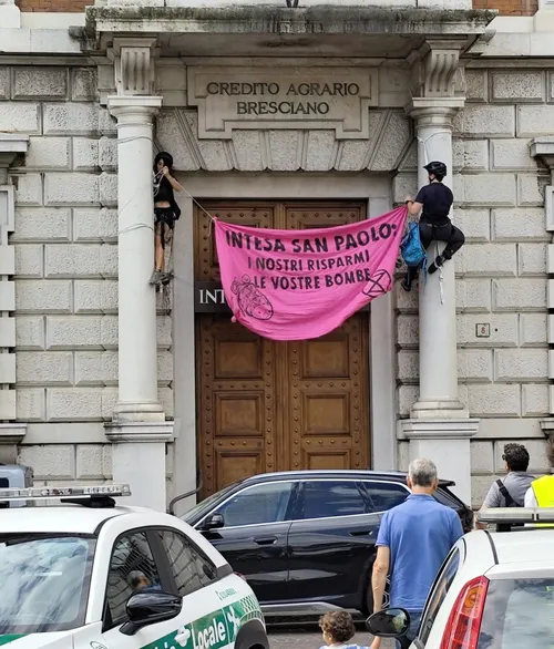 I climbers di XR hanno “scalato” gli ingressi della banca e aperto uno striscione recante la scritta “Intesa San Paolo: i nostri risparmi, le vostre bombe”, portando al contempo in piazza un salvadanaio a forma di granata per denunciare come l’istituto bancario italiano investa in armi e combustibili fossili.