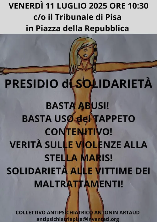 Radio Onda Rossa - Friday, July 4, 2025In comunicazione telefonica con Alberto, del Collettivo Antipsichiatrico Antonin Artaud di Pisa, abbiamo parlato del presidio di solidarietà che si terrà il venerdì 11 luglio alle ore 10:30 presso il Tribunale di Pisa per chiedere verità per le vittime delle violenze nella struttura di Montalto di Fauglia destinata a ospitare persone autistiche, gestita dalla Fondazione STELLA MARIS.