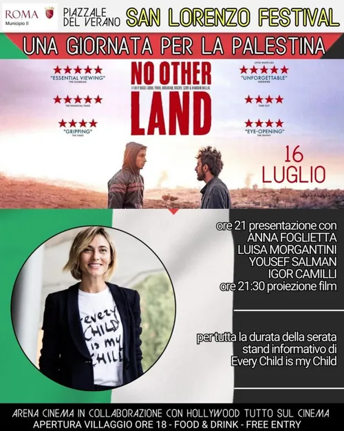 Assopace Palestina - Tuesday, July 15, 2025In data mercoledì 16 luglio alle ore 21, nei pressi del Piazzale del Verano, in occasione del San Lorenzo Festival che si sta svolgendo questi giorni a Roma, Luisa Morgantini, Anna Foglietta, Igor Camilli e il presidente della comunità Palestinese di Roma e del Lazio Yousef Salman, presenteranno insieme il docufilm premio Oscar “ No Other Land ”, diretto da Basel Adra, Yuval Abraham, Rachel Szor, Hamdan Ballal.