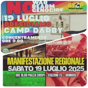 Per questo, dalla Puglia alla Toscana, dal Comando della stazione navale di Brindisi alla base americana di Camp Darby, ci mobilitiamo il 19 luglio per dire no a qualsiasi militarizzazione dei territori, per bloccare le infrastrutture della guerra globale.