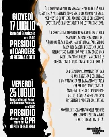 Radio Onda Rossa - Wednesday, July 16, 2025In collegamento telefonico un compagno dell'Assemblea di solidarietà e lotta di Roma racconta il quadro complessivo in cui si inseriscono i seguenti appuntamenti: