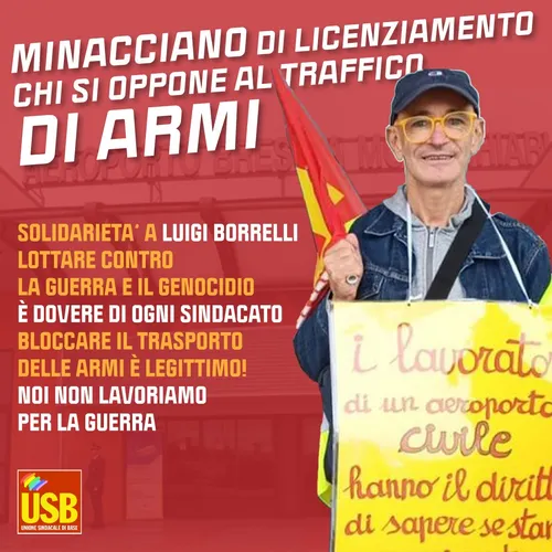 Radio Onda d`Urto - Thursday, July 17, 2025“Io sto con Luigi – noi non lavoriamo per la guerra”. E’ con queste parole che il sindacato di base Usb dà appuntamento oggi, giovedì 17 luglio, davanti alla Prefettura di Brescia in Piazza Duomo, in solidarietà con Luigi Borrelli, aeroportuale dello scalo civile e commerciale di Montichiari che ha denunciato il traffico di armamenti e munizioni presso l’aeroporto bresciano.