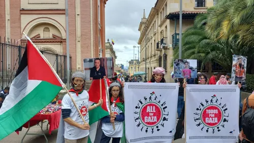 Nella giornata del 16 luglio le mobilitazioni in difesa della Palestina sono iniziate di prima mattina di fronte al palazzo della Cancelleria, dove si incontravano i delegati dei governi per il vertice: centinaia di persone hanno affollato il centro storico per chiedere forti sanzioni nei confronti di Israele. Le strade del centro di Bogotà sono state occupate da bandiere, cartelli, la classica batucada che segnava il ritmo dei cori e risuonava nelle vie circostanti della Candelaria, manifesti e volantini che denunciavano le imprese conniventi con il genocidio distribuiti ed esposti nelle strade e nei negozi, slogan che chiedevano sanzioni, fine del genocidio, libertà e autodeterminazione per la Palestina. A seguire, un concerto nella centralissima plaza de Bolívar, che si è concluso in tarda serata, con diverse band che si sono esibite raccogliendo fondi per la solidarietà con il popolo palestinese.