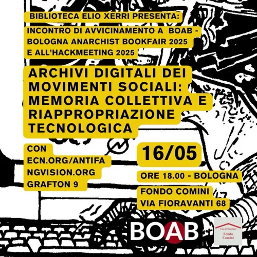 ARCHIVIO GRAFTON9 - Wednesday, May 21, 2025Lo scorso 16 maggio a Bologna si è tenuta una discussione, in un evento di preparazione alla Bologna Anarchist Book Fair che si terrà il prossimo settembre, su alcuni progetti web nati e sviluppatisi negli ambienti dell’antagonismo e dei centri sociali. L’evento è stato descritto come Archivi digitali dei movimenti sociali: memoria collettiva e riappropriazione tecnologica.