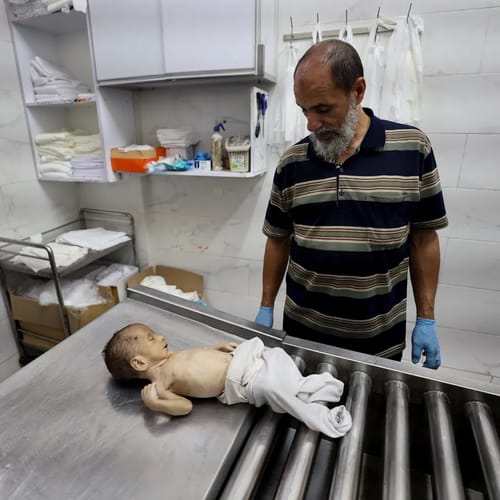 Un infermiere pulisce il corpo del giovane palestinese Abdul Jawad al-Ghalban, 14 anni, morto di fame martedì all’obitorio dell’ospedale Nasser di Khan Yunis, nella Striscia di Gaza meridionale. AFPIn entrambi i casi, il caos creato dai combattimenti, i ripetuti sfollamenti della popolazione e il collasso del sistema sanitario stanno privando i bambini più bisognosi di cibo e quindi della possibilità di sopravvivere.