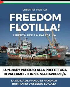 Pressenza - Sunday, July 27, 2025Le associazioni pacifiste, i movimenti antimilitaristi, gruppi e collettivi anticapitalisti siciliani si danno appuntamento domani pomeriggio davanti a tutte le prefetture siciliane in solidarietà con la nave Handala e il suo equipaggio e con tutto il popolo palestinese.
